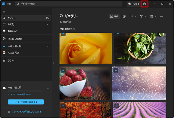 1. 「フォト」を起動し、画面右上の「」(設定)をクリックします。