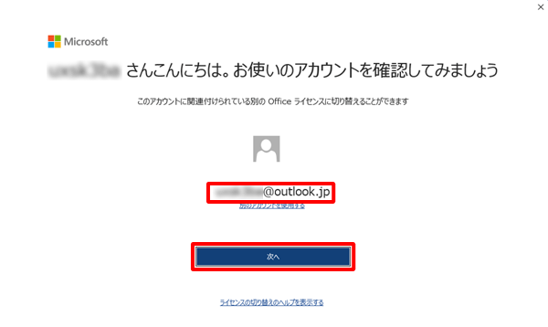 Office Home & Business 2024に切り替えたMicrosoft アカウントが表示されていることを確認し、「次へ」をクリックします。